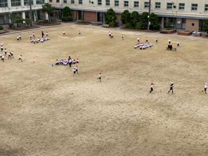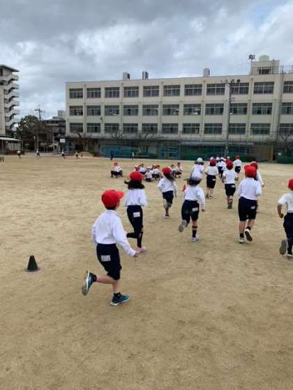 運動場から元気な声が聞こえてきたので、のぞいてみると1年生が体育でかけ足をしていました。