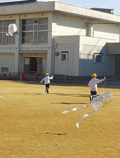 生活科の昔遊びの単元で作った「たこ」をあげています。風も適度に吹いていて、みんな楽しそうに遊んでいました。