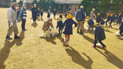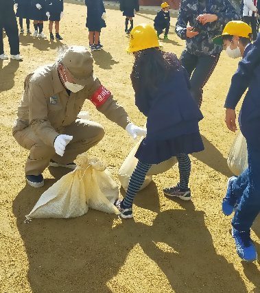 3年生は、前の時間に5年生が作った「土嚢」を使って、「土嚢積み体験」をしました。ここでも、淀川右岸水防事務所と地域の水防団のみなさまが指揮してくださいました。