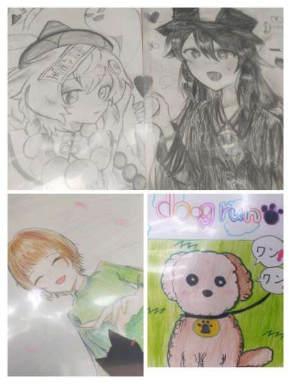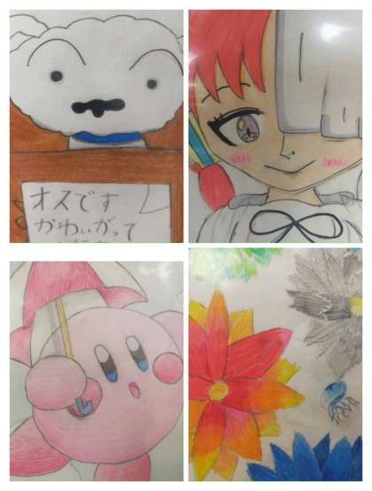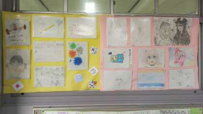イラストクラブの作品を職員室前に掲示しています。学校にお越しの際はぜひご覧ください。