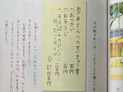 3年生の道徳は、「お母さんのせいきゅう書」というお話です。