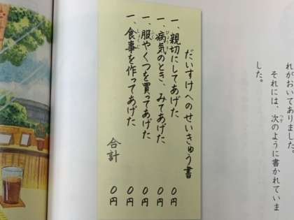 お手伝いをしたからとお母さんに、お駄賃を請求する主人公のだいすけに対して、いつもだいすけのため、家族のためにお母さんがしたことに対するだいすけへの請求書は、全て0円。