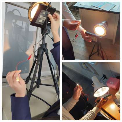 残念ながら、太陽光での実験はできませんでしたが、ライトを使っての光電池の発電について実験することができました。