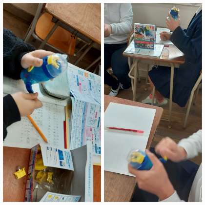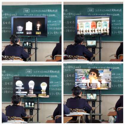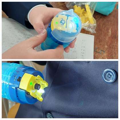 たくわえた電気を確かめるために、豆電気と発光ダイオードにつなげてみると、それぞれ明かりがついている時間に差ができました。