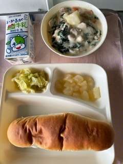 「ほうれんそうのクリームシチュー」は、児童生徒に毎回人気の献立です。小麦粉と綿実油でホワイトルゥを作り、クリームでコクを出しています。