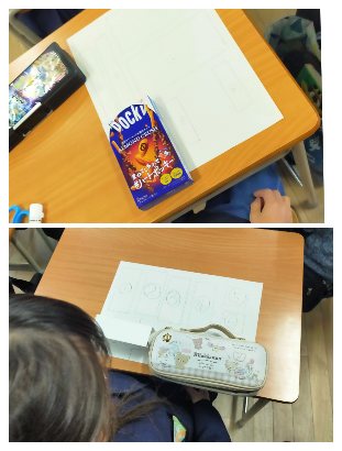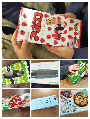 2年1組の児童が机上にお菓子やティッシュペーパーの箱を出しています。算数の単元「はこの形」の学習に使うためです。台紙に箱のいろいろな面を縁取り書きして、面の形が同じだったり、違ったりしていることを調べています。立体(直方体・立方体)の学習につがなる重要な単元です。