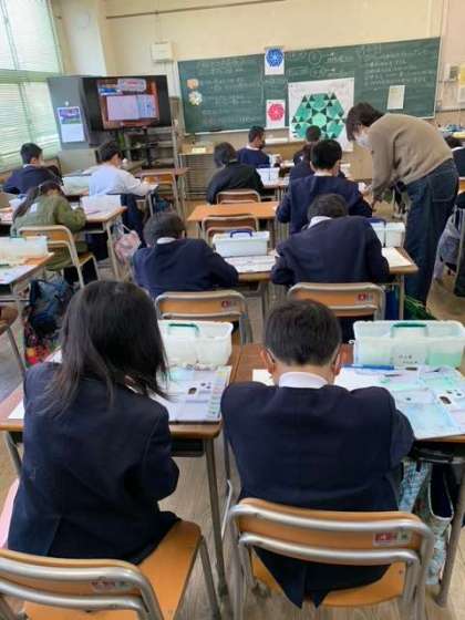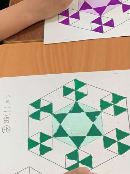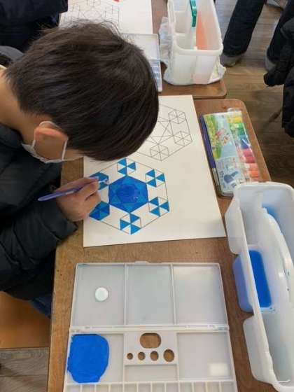 4年生の図画工作科は、「自分だけの宝石」をしています。幾何学模様に並んだ図形に、規則的に水彩絵の具をのせまていきます。一つ一つのスペースに色が埋まるごとに、美しさが感じられます。