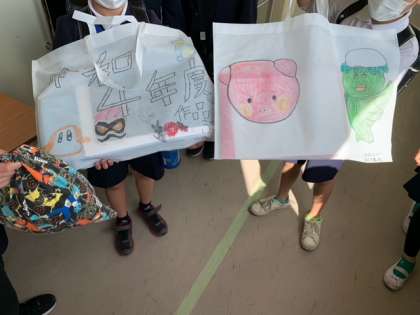 色々な荷物や、作品袋を持ち帰る様子が見られています。(写真下は、5年生の下校時の廊下風景です。)
