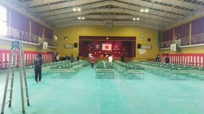 明日の天気予報は雨模様ですが、ピカピカの新1年生たちがはりきって学校生活をスタートできるような入学式にしたいと教職員一同ただいま会場設営中です。