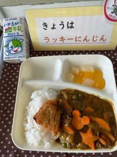 入学祝い献立です。児童生徒に好評な「カツカレーライス」に一口トンカツがつきます。ラッキーにんじんの献立です。