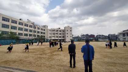 家庭科室から出火し、燃え広がる可能性があるため避難するという設定で避難訓練を行いました。いざという時に、全員の命が助かるために真剣に訓練しています。どのクラスも「おはしも」(おさない・はしらない・しゃべらない・もどらない)を意識して避難することができていました。