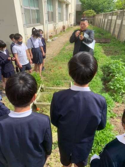 5年生の理科は、アブラナの花のつくりを学習しています。その学習と関連づけて、今日は、大桐小学校にある木や草花がどのくらいあるのか校舎裏などをぐるりと回りながら観察しました。