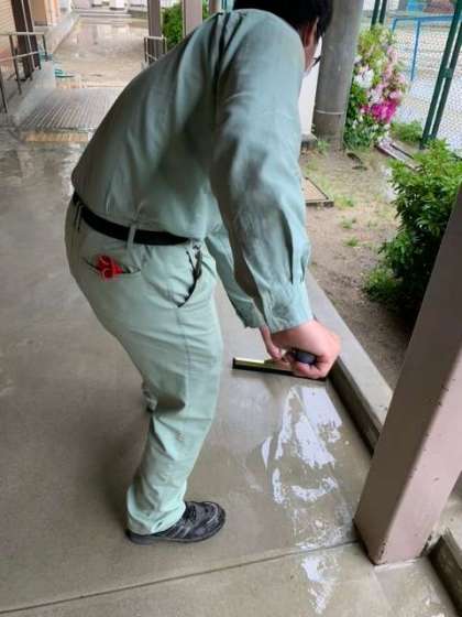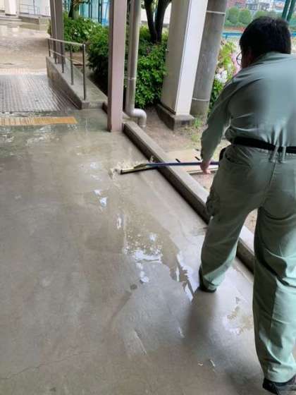 子どもたちが滑ってケガなどしないように、管理作業員さんが、水切りで対応してくださっていました。素早い対応がありがたいです。