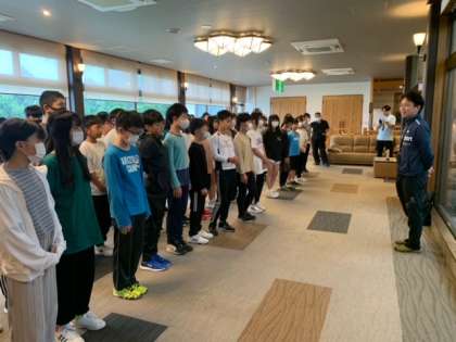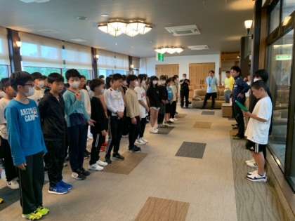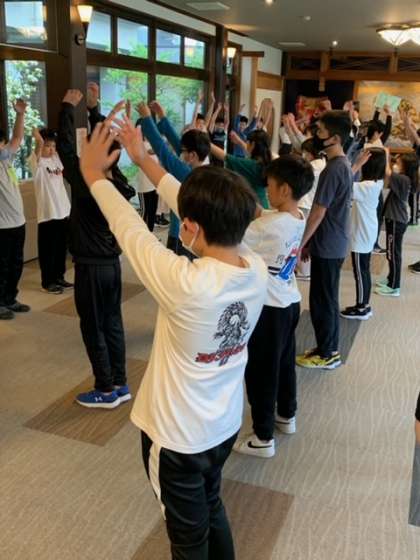 小雨のため朝の集い・ラジオ体操は、宿舎のロビーで行いました。