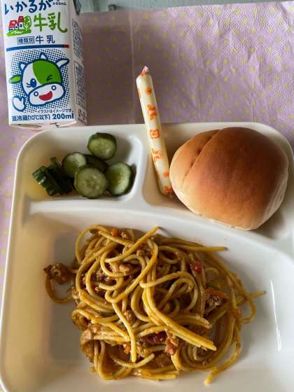 「カレースープスパゲッティ」は、豚ひき肉を主材に、ベーコンで旨みを増し、カレールゥの素などで味つけしたスパゲッティです。児童生徒に好評な献立です。