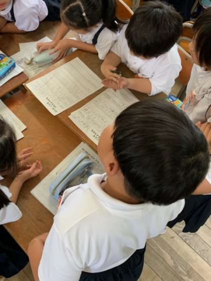 先日、町たんけんで調べた施設やお店のことをクラスの他の友だちに、どのように伝えよえうかと話し合っていました。