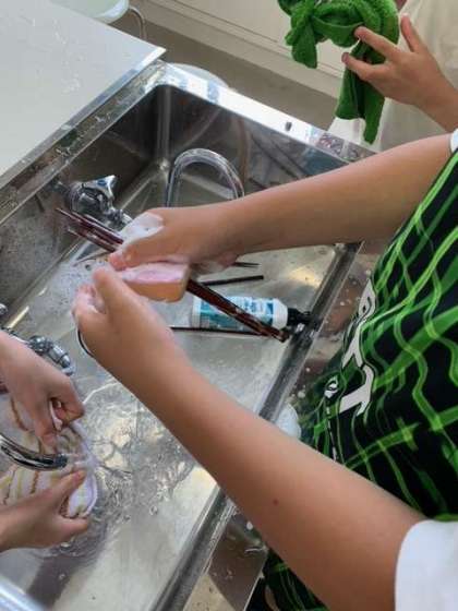 お陰で、調理中のシャッターチャンスを逃してしまいました。野菜炒めをいただいているところとお片付けの様子だけですみません。