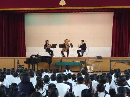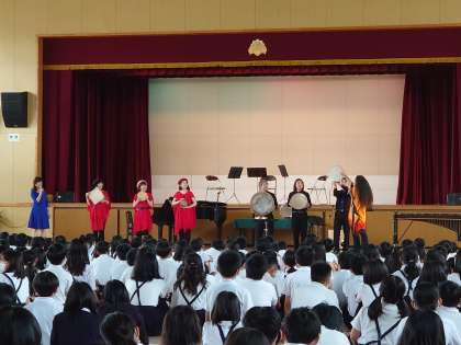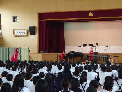 プロの演奏家を招いての音楽鑑賞会を実施しました。みんなが知っているアニメの曲も交えながらの演奏で、楽しく鑑賞しました。タンバリン博士による世界のタンバリン紹介も、興味深かったです。