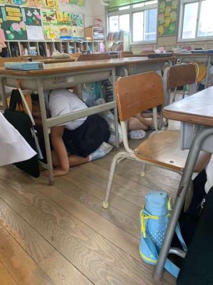 大きな揺れがおさまるまでは、机の下にもぐります。揺れがおさまったら運動場へ1次避難し、その後、河川の氾濫や津波想定で3階以上に2次避難します。