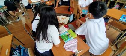 制限時間2分で、自分の選んだ本の良さや面白さをを班の友だちに話します。担任の八野先生も1冊選んで、子どもたちに紹介していました。