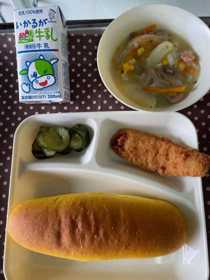 「豆乳スープ」はベーコンで旨みを出し、じゃがいも、たまねぎ、にんじん、コーン、パセリ、マッシュルームを使用した、豆乳のまろやかさを生かしたスープです。