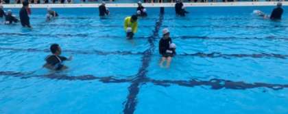 3時間目のプールの授業の様子です。1年生と6年生の合同での授業です。6年生のお兄ちゃん・お姉ちゃんが1年生の子の手を持って泳ぎの補助をしてくれます。