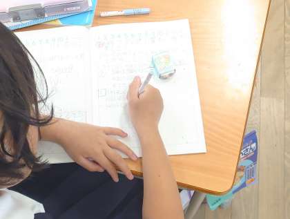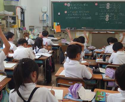 100のまとまりをつかって数を数える方法を考えています。元気よく手を挙げて発表もできました。