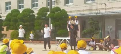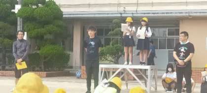 朝の児童集会です。先生が3人呼ばれて前に立っています。この3人の先生の中から1人の先生を当てます。