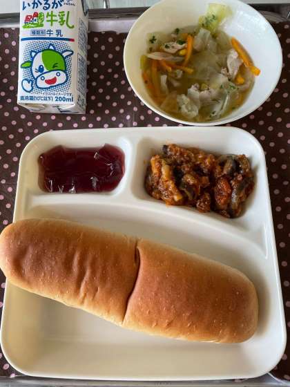「なすのミートグラタン」は、なすをひき肉、マカロニ、玉ねぎとともにケチャップ味のグラタンにしています。粉末チーズを使用していないので、乳アレルギーの児童生徒も食べることができます。