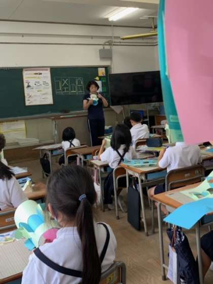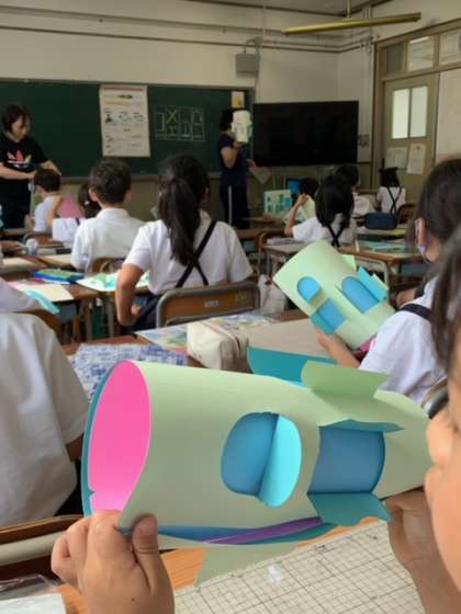 クルッと巻いて円柱状にすると、オシャレな窓のある建物になります。「お城みたいー。」と、子どもたちそれぞれに、イメージを膨らませていました。
