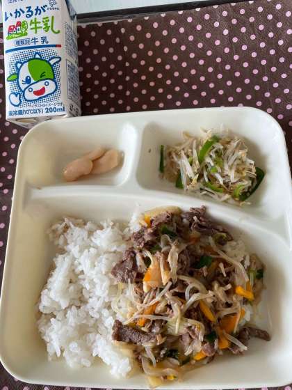 「牛丼」は、児童生徒に人気の献立で、牛肉、糸こんにゃく、たまねぎ、にんじん、えのきたけを甘辛く味つけし、煮ています。斜め切りの青ネギで彩りを添えています。
