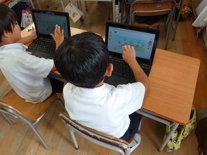 デジタルドリルに初挑戦です。指で線を描いたり答えを入力したりしました。正解するとトロフィーがもらえます。慣れてきた子は、いくつも問題を解き進みました。