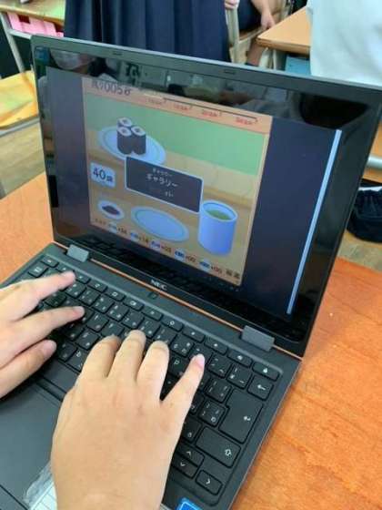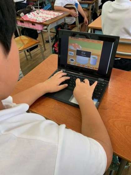 給食を食べ終えるくらいの時間に、5年生の教室をお邪魔しました。すると、給食を食べ終えた一人の子が、猛烈な勢いでタイピングをしている様子を見かけました。かなり速い!!