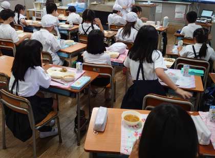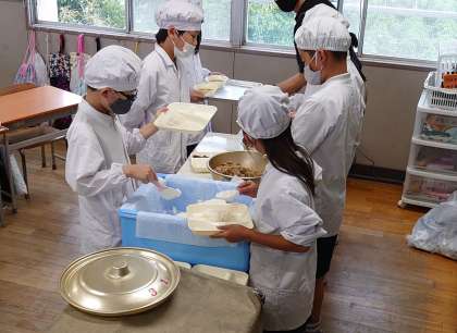 給食室から給食を運んで来たら、教室で配膳します。ご飯やおかずの盛り付けも上手になっていて、さすが3年生という様子です。みんなで元気に「いただきます!」を言って、うれしそうに食べ始めていました。