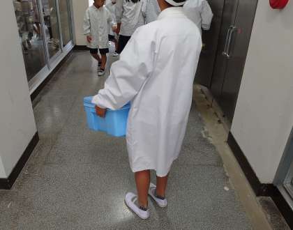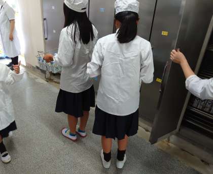 各学級の給食当番が給食室に給食を取りに来ました。給食室では、給食委員会の児童が、調理員さん達のお手伝いで、ご飯の容器や牛乳を渡していきます。