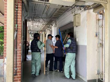 授業中に不審者が校内に侵入したという想定で、防犯避難訓練をしました。万が一に備え、1人残らず児童を守るために、不審者役の教職員も取り押さえる教職員も真剣です。警察とも連携して、児童の安全を守ります。