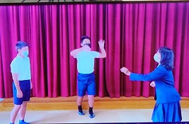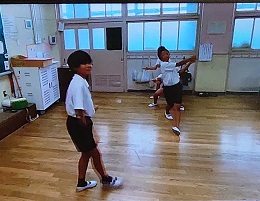 集会の時間に、校内テレビ放送で、スポーツ委員会の発表がありました。今回は、動きから何のスポーツをしているかを当てるクイズと、そのスポーツについての解説をしました。教室で見ている児童も、楽しんでいました。
