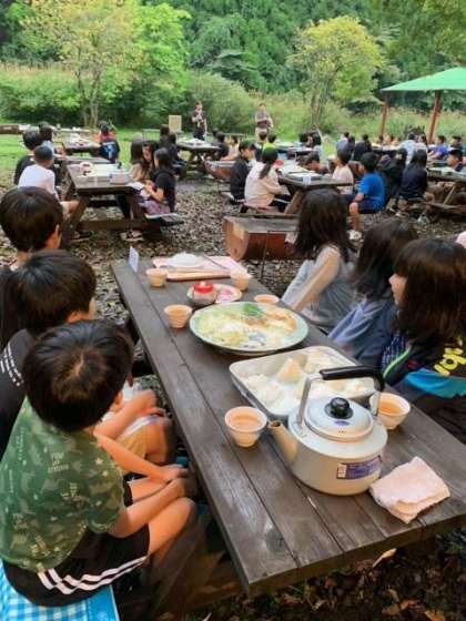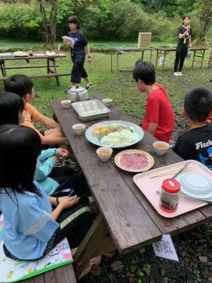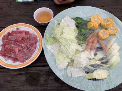 バーベキューの具材に、子どもたちだけで座っている様子が可愛らしいです。