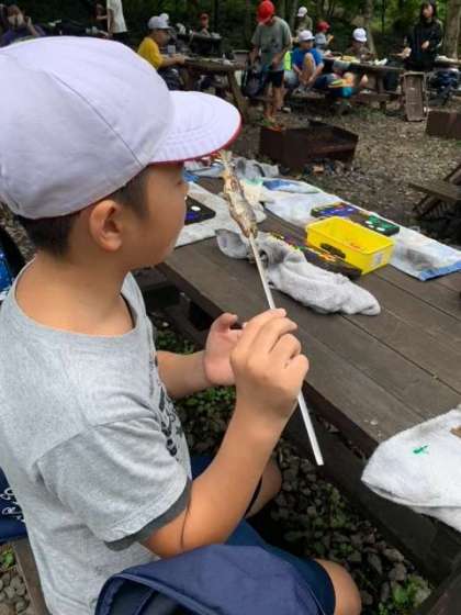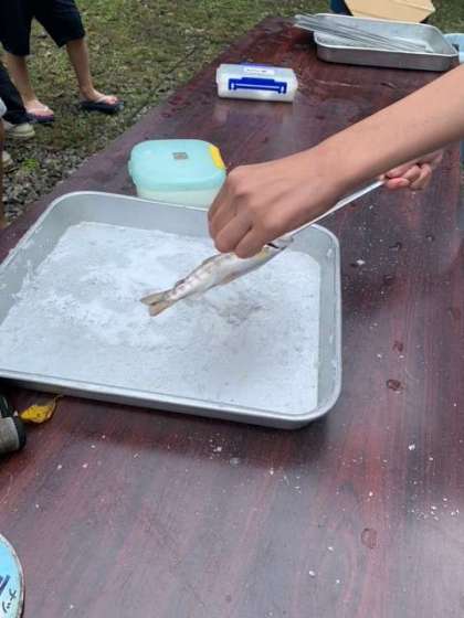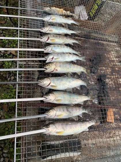 つかまえたアマゴは、自分で塩をふり、スタッフの方が焼いてくださいます。