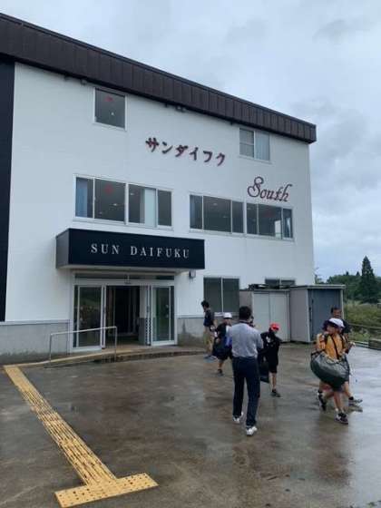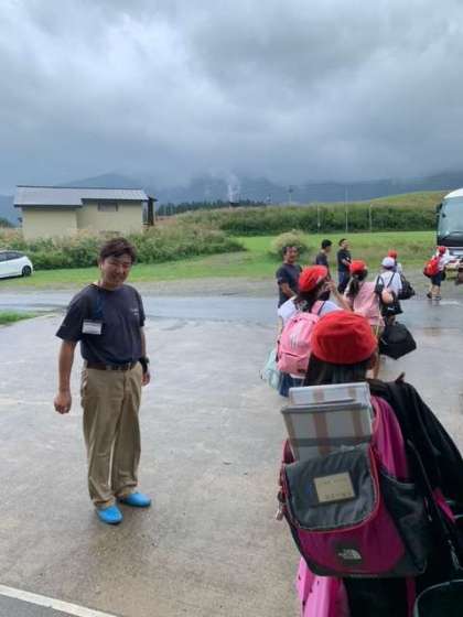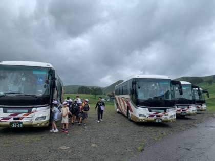 サンダイフクさんを出発しました。鉢伏高原も雨が降り出しました。雨の中、お宿の方が、笑顔で子どもたちを見送ってくださいました。安全に気をつけて帰ります。