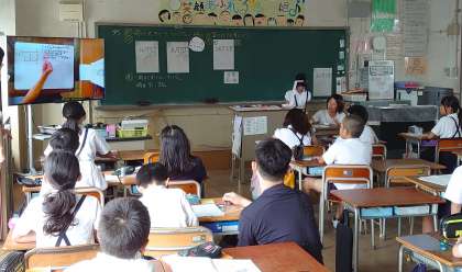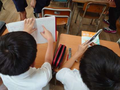 1度たてた商では計算できない場合のわり算の筆算の仕方を学習しました。これまでの学習内容を踏まえ、友だちとの考えの交流も活発にできました。自分の考えを書いたノートやボードを書画カメラを使って大型モニターに映し、説明もしました。