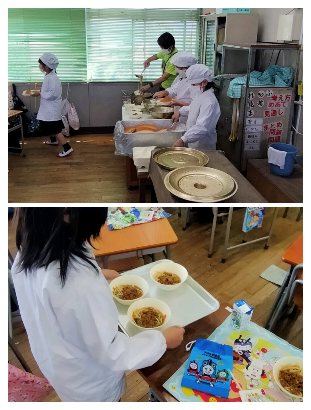 子どもたちが楽しみにしているのは、やはり休み時間と給食の時間です。てきぱきと動き、みんなで協力しながら配膳していました。