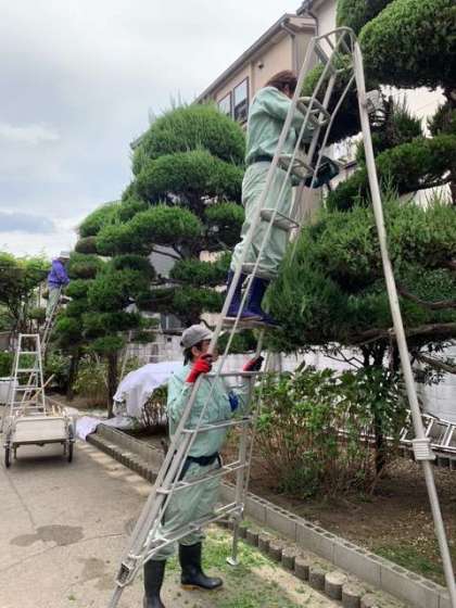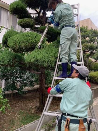 高木の「イブキ」(写真中、上)も綺麗にカットしてくださっていました。「エッジトリマー」という工具を使って綺麗に葉を整えていきます。「エッジトリマー」は、重たく高所での作業は大変です。
