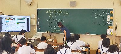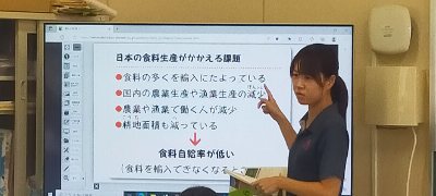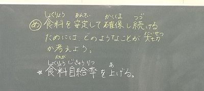 先生が「食料自給率を上げるためには?」と問い、「国産のものを食べる」や「地産地消」などの発言が出てきて、また全体での話し合いになりました。