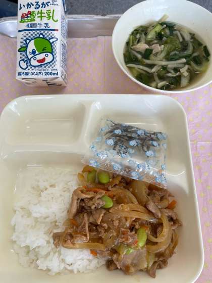 「ピリ辛丼」は、豚肉を主材にたまねぎ、にんじん、青みにむきえだまめを使用し、砂糖、こしょう、こいくちしょうゆ、赤みそで味つけし、トウバンジャンで辛みをつけています。でん粉でとろみをつけ、ご飯によくからむようにしています。