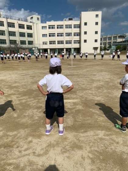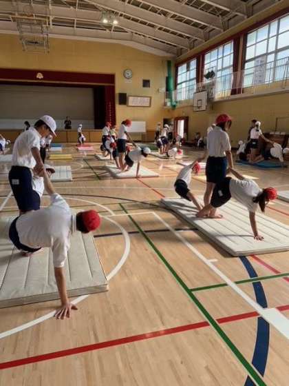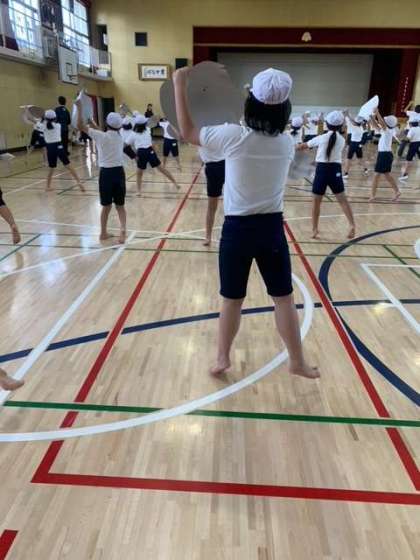 1年生玉入れ、3年生花笠音頭、6年生組体操の練習風景です。