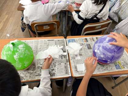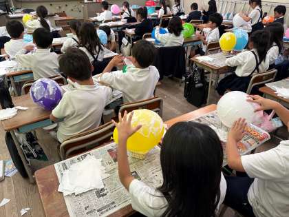 恐竜の卵を作っています。風船に和紙を貼っていき、たまごの形に仕上げていきます。和紙をはるのが難しくて、苦労していました。集中してやっていたため、今日の2時間で卵の形だけは作ることができました。