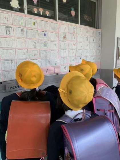 色々な子が立ち止まって、自分や、きょうだい、友だちの紹介を探しては読んでいます。