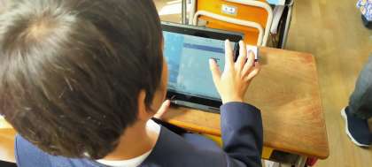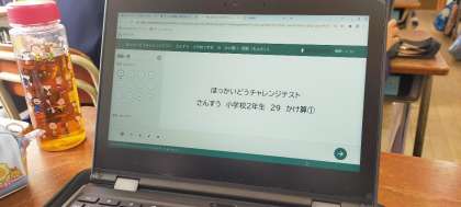 1人1台端末を使って、2年生がナビマで算数のかけ算を復習しています。ナビマが終わった子からメクビットを使って北海道教育委員会が作成した「北海道チャレンジテスト」のかけ算問題にチャレンジしてみました。