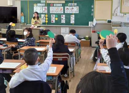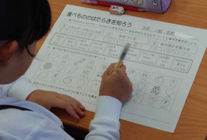 今回の食育の授業では、食品の、働きによる3色のグループ分けについて学びました。給食に実際に出てくるメニューに使われている食材をグループ分けをし、給食には栄養のバランスがよくなるよう工夫されていることもわかりました。苦手な食べ物も、少しずつ食べようという気持ちをもってもらいたいです。